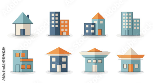 Collection of eight different minimalist building icons, including houses and office buildings, in blue, orange, and white.