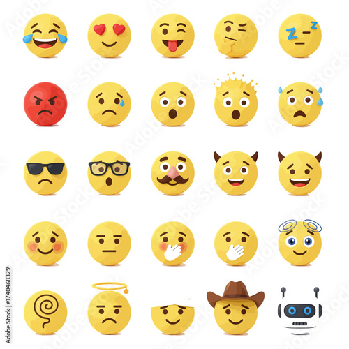 icon, expression, yellow, white background, surface, aligned, collection, crying, sleeping, angry, sad, surprised, crown, worried, sunglasses, goggles, moustache, devil, smiling, reddening, neutral, coughing, dizzy, halo, injured, cowboy, robot, communication, digital, cyberspace, emotion, feeling, mood, character, graphic, design, symbol, face, round, sphere, isolated, with, various
