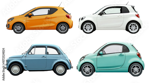 collection of four colorful cars showcasing different styles and designs, including orange compact car, white modern vehicle, blue vintage car, and teal small car. ,PNG Transparency