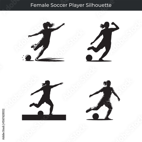 silhouette, soccer, football, athlete, sport, action, kick, running, ball, black, white, vector, illustration, graphic, design, set, collection, activity, competition, play, game, female, woman, team, activewear, active, strength, skill, movement, training, fitness, goal, succeed, champion, isolated, artistic, minimalist, modern