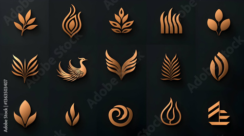 logotype, design, branding, symbol, icon, graphic, abstract, gold, bronze, copper, metallic, plant, leaf, feather, bird, phoenix, fire, flames, nature, minimal, geometric, elegant, luxury, premium, vector, illustration, art, dark, background, pattern