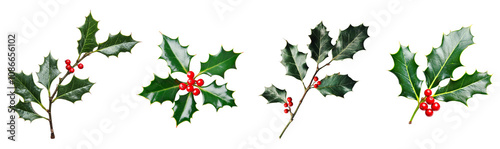 Collection of green holly leaves with red berries in various arrangements, for merry Christmas decorations and festive holiday isolated on background.