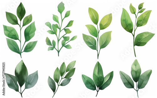 Collection of green watercolor foliage plants clipart on white background. Botanical spring summer leaves illustration. Suitable for wedding invitations, greeting cards, frames and bouquets.