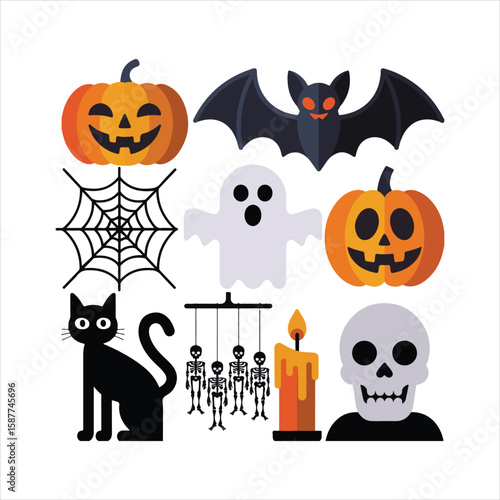 halloween, pumpkin, jack-o-lantern, bat, ghost, skeleton, spider's web, black, cat, candle, skittish, scarey, horror, celebration, autumn, fall, holiday, illustration, icon, vector