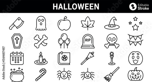 halloween, icon, set, collection, ghost, apple, leaf, sorcerer, hat, star, coffin, bone, balloon, gravestone, rip, skull, bunting, calendar, candle, spell, book, wand, candleholder, pumpkin, cauldron, candy, cane, spider, broom, carved, skittish, holiday, celebration, vector, illustration
