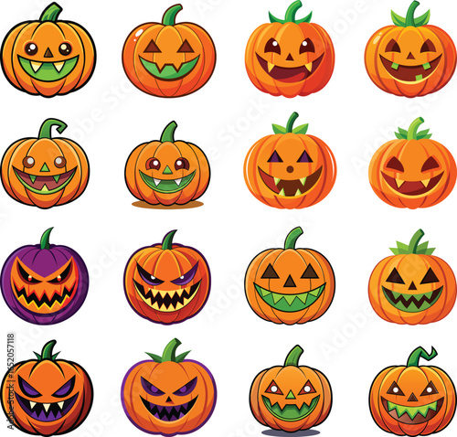 Collection of Halloween Pumpkin Faces with Smiling and Angry Expressions for Spooky Holiday Fun and Decoration Design