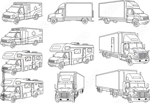 truck, illustration, vignetting, drawing, line, art, vehicle, transportation, commercial, delivery, logistic, cargo, heavy, duty, semi, tractor, trailer, box, flatbed, van, pickup, recreational vehicles, motorhome, camper, recreational, white, background, outline, hand, drawn, design, graphic, icon, set, collection, isolated, simple, clean, modern, automotive