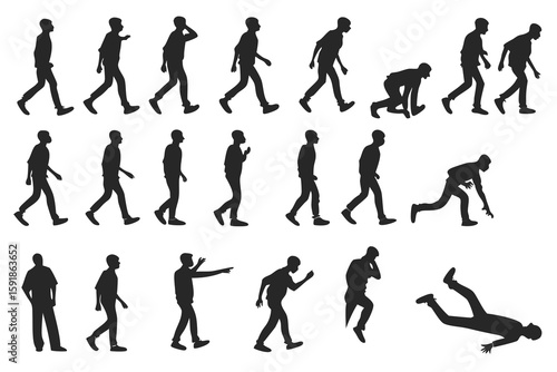 silhouette, figure, human, man, male, person, walking, running, movement, motion, action, sequence, step, stride, pose, position, falling, fall, down, ground, athletic, exercise, activity, dynamic, energetic, illustration, graphic, design, art, vector, isolated, white, background, concept, progress
