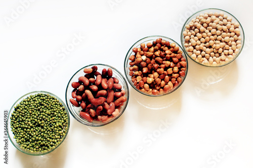 Collection of legumes (chickpeas, green peas, Pink lentils, Indian lentils, red beans, green mung beans, Red Kidney) isolated on white background.