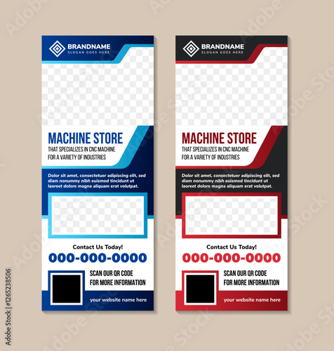collection of machine store sale roll up Banner Design Template with space for photo collage on rectangle shape. combination of white, black, red and blue colors. vertical layout background.