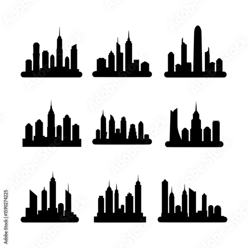 Collection of Minimalist Black City Skyline Silhouettes Representing Urban Landscapes and Architecture in Simple Graphic Forms