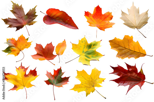 Collection of multicolored fallen autumn leaves isolated on transparent background