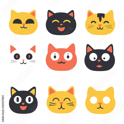 Collection of nine cute cartoon cat faces with varied colors and expressive emotions including smiling, winking, playful, and curious looks on white background vector illustration