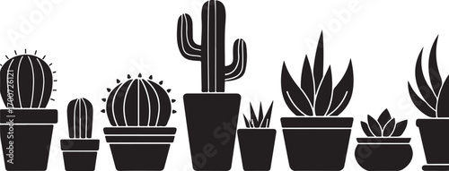 Collection of Potted Cacti and Succulents in Silhouette on White Background Keywords: cactus, succulent, potted plant, indoor plant, desert plant, green, nature, silhouette, black and white