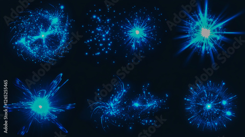 Collection of radiant blue luminous starbursts with vibrant beams on a dark background