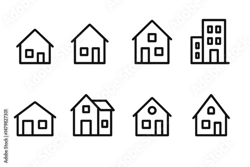 Collection of simple black and white web icons depicting various house designs and structures for digital use