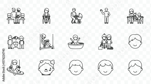 family, people, icon, silhouette, illustration, children, baby, eltern, couple, bench, sitting, travel, baggage, pushchair, pushchair, swing, skateboard, playing, bathe, washing, waving, person, head, face, boy, girl, simple, minimalist, graphic, design, clip art, vector, outline, line art