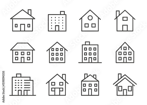 Collection of simple vector icons showcasing different house styles and building designs in a minimalist layout