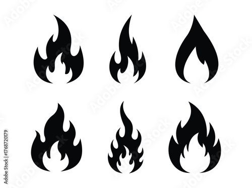 Collection of six different fire flame icons in black silhouette for design needs