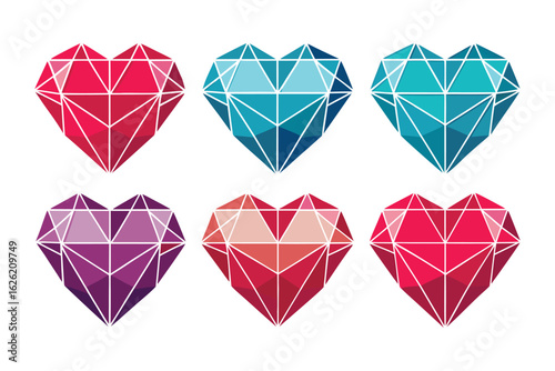 Collection of six faceted heart shapes in various colors including red, blue, teal, and purple, isolated on a white background