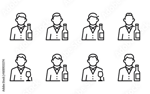 sommelier, wine, bottle, glasses, icon, set, collection, drink, beverage, alcohol, eatery, bar, service, waiter, server, hospitality, profession, job, career, uniform, suit, attaching, bow tie, wine tasting, gastronomy, enology, winery, vinery, drink, refreshment, illustration, graphic, design, symbol, pictogram, outline, minimalist, clean, simple, vector, white background