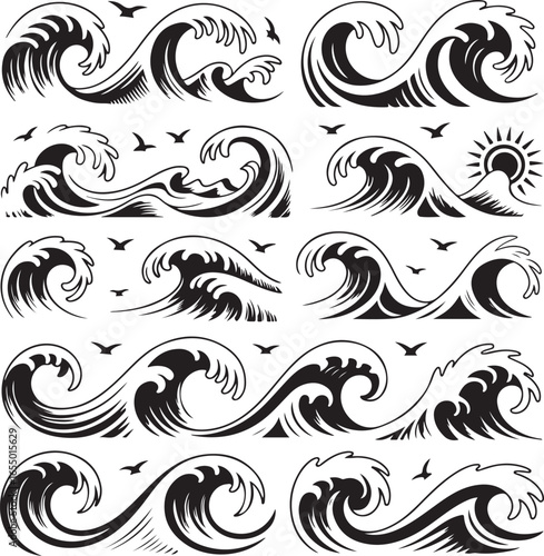 Collection of Stylized Black and White Ocean Wave Illustrations with Birds water nature