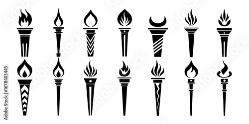 torch, flames, icon, silhouette, symbol, fire, light, olympic, sport, victory, award, competition, design, graphic, illustration, vector, set, collection, ancient, modern, energy, power, celebration, oneness, heritage, tradition, beacon, guiding, abstract, minimalist