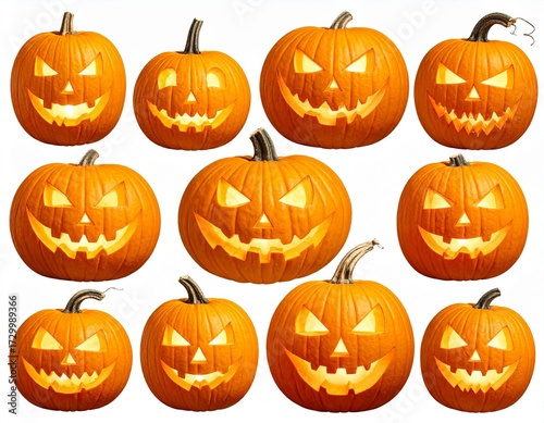 Collection of Ten Scary Jack-O'-Lanterns with Glowing Faces Isolated on White Background