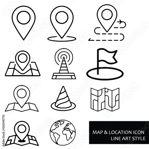 map, location, icon, icon, pin, marker, marker, route, navigation, global positioning system, direction, direction, signs, signs, symbol, symbol, travel, journey, cartography, geography, black, white, line art, line, art, simple, minimalist, minimal, graphic, design, element, element, set, collection, vector, illustration, globe, earth, flag, antennae, traffic cone