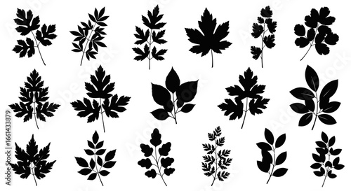 Collection of twenty diverse black silhouette leaves, botanical illustrations, plant sprigs.