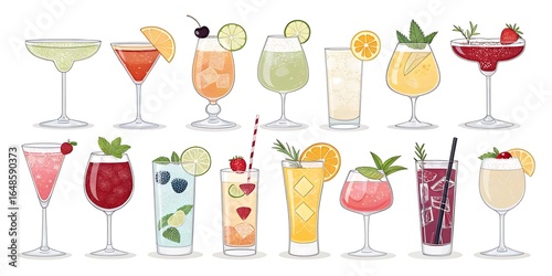 collection, various, cocktail, different, goggles, drink, martini, margarita, mojito, alcoholic, bar, glasses, party, lime, vector, cosmopolitan, beverage, tequila, juice, ice, lemon, summer, orange, tropical, set, menu, fruit, illustration, design, fresh, white, icon, colada, pina, blue, strawberry, cold, red, cherry, eatery, object, mint, gin, background, sunrise, beach, umbrella, wine