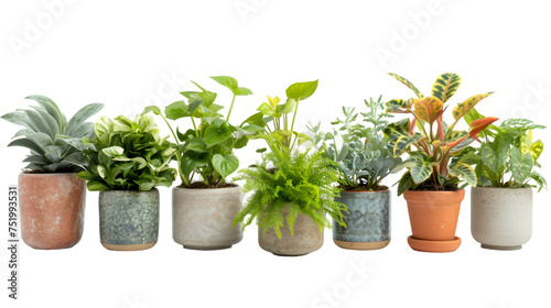 Collection of various houseplants displayed in ceramic pots isolated on transparent background