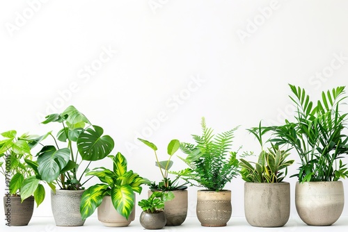 Collection of various houseplants displayed in ceramic pots with transparent background. Potted exotic house plants on white shelf against white wall. Home garden banner