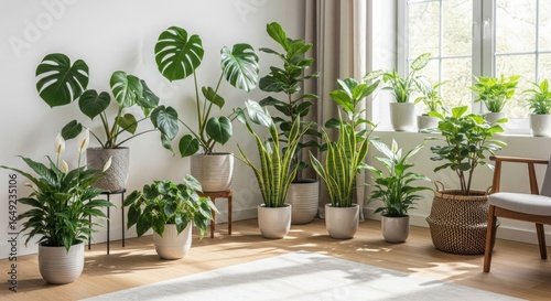 Collection of various houseplants in pots arranged in a bright room with natural light