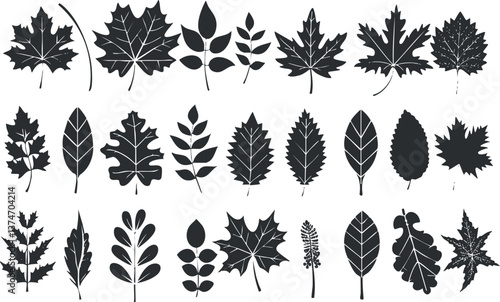 Collection of various leaf silhouettes in black and white, showcasing different botanical shapes.