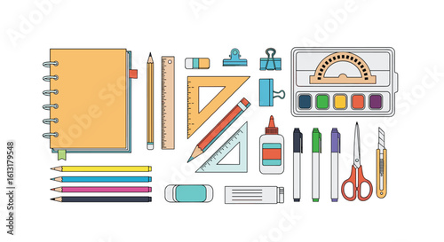 notebook, crayons, ruler, eraser, sharpener, scissors, pen, marker, paper clip, protractor, compass, fastener, stationery set, school supplies, office supply, art supply, back to school