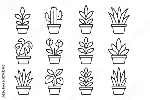 Collection of vector icons featuring various potted plants and cacti designed in a minimalist style