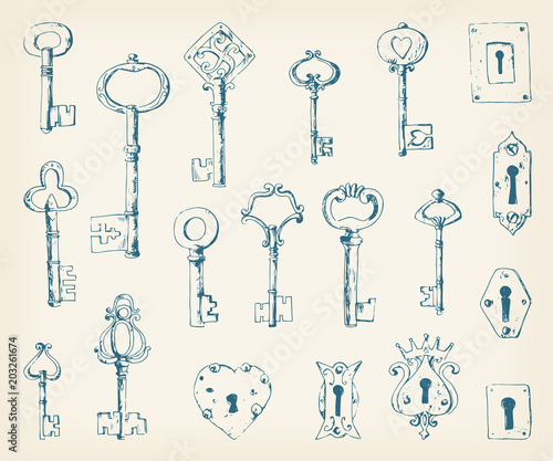 Collection of vintage ornate forged keys and keyholes. Sketchy s