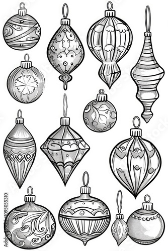 Collection of vintage-style ornaments in black and white, ideal for use on Christmas cards or as a decorative element