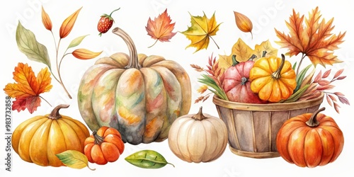 Collection of watercolor s featuring autumn items, watercolor, s, autumn, fall, leaves, pumpkins, acorns, apples