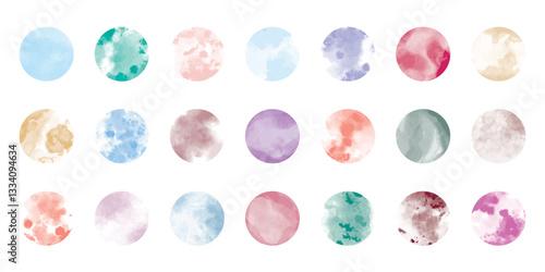 Collection of watercolor texture circles of different colors. Set of round spots of spread paints. Samples red, green, blue, beige, purple, green pink colors. Vector graphics