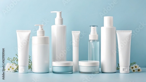 Collection of white cosmetic bottles and tubes arranged on a light blue background