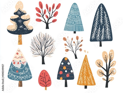 Collection of winter-themed illustrations featuring trees and festive designs on a white background