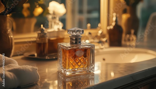Cologne bottle on a bathroom counter, with a focus on luxury and detail, Sophisticated, Warm, Detailed