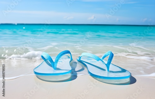 color flip-flops on white beach sand over blue transparent ocean wave background