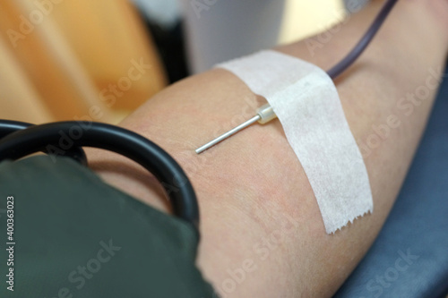 Color image depicting a blood donor in the process of donating blood in a medical clinic. Focus on the donor's arm.