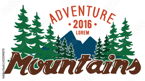 Color vector template with stylized inscription, mountains and forest. Editable for design