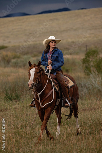 horse, colorado, riding, mountain, horse, mountain, range, ranch, equine, equestrian, western, saddle, ride, horseback, cowboy hat, leather, rope, jacket, woman, rider, outdoors, field, cowboy, bridle, rural, training