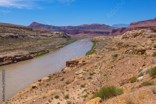 Colorado river winds through Utah desert on a very hot sunny day. Red rocks and sand in a dry country. River canyon in the desert. Geology of American west. Driving across the USA.