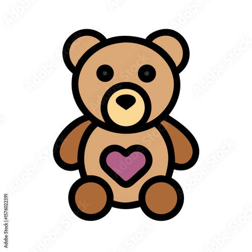 Colored vector icon of a brown teddy bear with a heart on its belly, symbolizing childhood, love, and gift-giving. Isolated on a white background